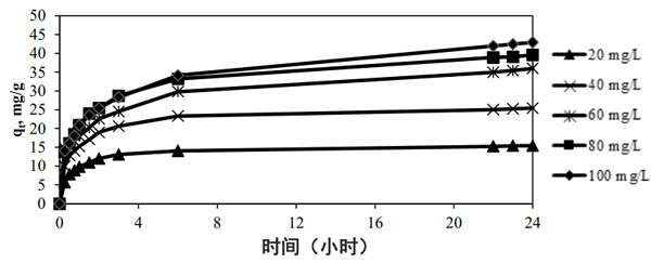 圖2說(shuō)明了甲基黃初始濃度和接觸時(shí)間對(duì)30°C時(shí)吸附平衡的影響。隨著初始染料濃度從20 mg/L增加到100 mg/L,發(fā)現(xiàn)平衡時(shí)的染料吸附量增加。這些表明初始濃度提供了必要的驅(qū)動(dòng)力,以克服對(duì)染料分子在水相和固相之間傳質(zhì)的阻力。初始濃度越高,濃度梯度的驅(qū)動(dòng)力越大。從圖中可以看出,較高的初始濃度的染料溶液需要更長(zhǎng)的接觸時(shí)間才能達(dá)到平衡。初始濃度為20-40 mg/L的染料溶液達(dá)到平衡所需的接觸時(shí)間約為3-5小時(shí)。