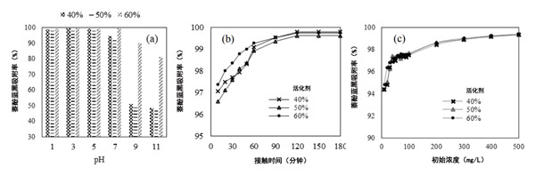 圖2:(a)pH(b)接觸時(shí)間和(c)在不同的活化劑濃度下初始濃度對萘酚藍(lán)黑吸收的影響。