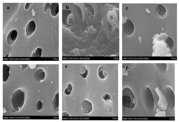 圖2:在0(a),2(b),4(c),6(d),8(e),10(f)循環(huán)數后經過再生處理的活性炭的SEM圖像。