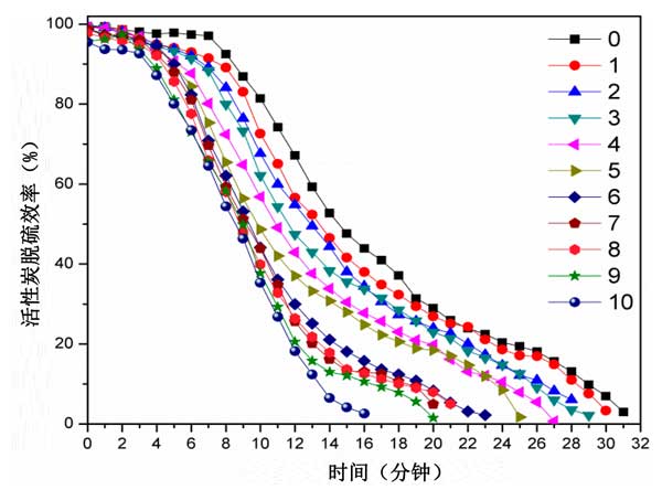 圖3:再生活性炭的脫硫效率,其中0-10代表循環(huán)數。