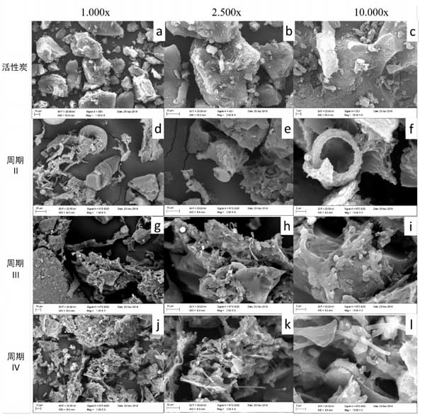 觀察圖3所示的圖像,處理期間生物量顯著增加,其中存在大量生物材料,可能的絲狀形成和微生物團(tuán)聚,表明存在較大量步驟IV中的生物量。至于生物膜的發(fā)展,觀察顯微照片增加了10,000倍(圖3C,3I和3L),注意到附著在活性炭表面的微生物的生長。這些可能是細(xì)菌,真菌和絲狀細(xì)菌,活性炭在反應(yīng)器運行110天后,固體樣品中的細(xì)菌含量更高。