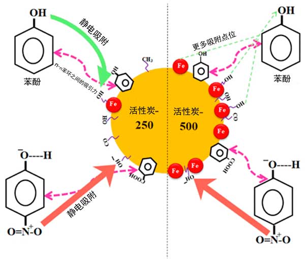 圖1:通過氫鍵和π-π相互作用將酚類吸附到活性炭上的機理。