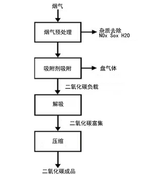 二氧化碳的吸附技術(shù)的簡化圖在圖二顯示。首先將煙氣中的水分,硫和氮氧化物凈化。然后,所制備的氣體進(jìn)入使用固態(tài)吸附劑的吸附階段,例如活性炭,沸石,金屬有機骨架,多孔聚合物,基于堿金屬和胺的碳酸鹽的固體材料,碳球等。之后,吸附劑進(jìn)入解吸階段,在此階段釋放出富含CO2的氣體混合物,然后在壓力下將其壓縮。該技術(shù)的優(yōu)點是二氧化碳萃取效率高,再生成本低以及吸附劑操作的穩(wěn)定性;钚蕴繉O2和N2的吸附能力很高,具有不同于沸石的大比表面積,并且還可以在潮濕條件下工作。而且,活性炭比沸石具有更低的吸附熱,因此它們可以更容易地再生。因此,在25°C和1bar的溫度下,活性炭的吸附熱為3kJ,而沸石為30kJ。收集二氧化碳的吸附劑質(zhì)量的重要指標(biāo)之一是二氧化碳的吸附量。基本上,在靜態(tài)條件下和動態(tài)條件下都進(jìn)行吸附容量的研究。