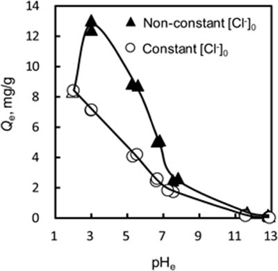 活性炭上的硝酸根離子吸附量與溶液的pH e之間的關(guān)系如圖1所示。硝酸根離子在堿性條件下幾乎不被吸附,這意味著氫氧根離子會(huì)抑制硝酸根離子的吸附。另一方面,隨著平衡pH的降低,硝酸根離子的吸附量增加。在堿性條件下,由于硝酸根離子與活性炭表面之間的靜電排斥,硝酸根離子很難被吸附在活性炭上。另一方面,硝酸根離子的吸附量在酸性條件下增加,這歸因于硝酸根離子與碳表面之間的靜電吸引力。然而,隨著平衡pH從3.0降低到2.0,觀察到硝酸根離子吸附的顯著降低。在此pH范圍內(nèi),氯離子的初始濃度從2 m增加到20 m M,這意味著共存的氯離子會(huì)抑制硝酸根離子的吸附。通過(guò)NaCl溶液將氯離子的初始濃度固定在20 m M時(shí),可以清楚地發(fā)現(xiàn)氯離子對(duì)硝酸根離子的吸附抑制作用,表明硝酸根離子在所有pH區(qū)域的吸附量均低于沒(méi)有任何pH調(diào)節(jié)的溶液。因此共存陰離子會(huì)導(dǎo)致競(jìng)爭(zhēng)吸附影響硝酸根離子吸附的效果,并且這種作用可能是較強(qiáng)的在共存陰離子的濃度較高。