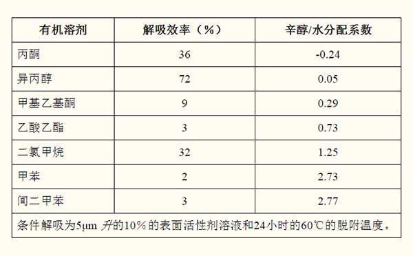 七種有機溶劑解吸效率表示與圖1。實驗條件5米升的10%的表面活性劑溶液和60℃24個小時解吸溫度。的有機溶劑的解吸效率是3%,72%,9%,3%,32%,2%,而對于丙酮,異丙醇,甲基乙基酮,醋酸乙酯,二氯甲烷,甲苯,和3%的米二甲苯。