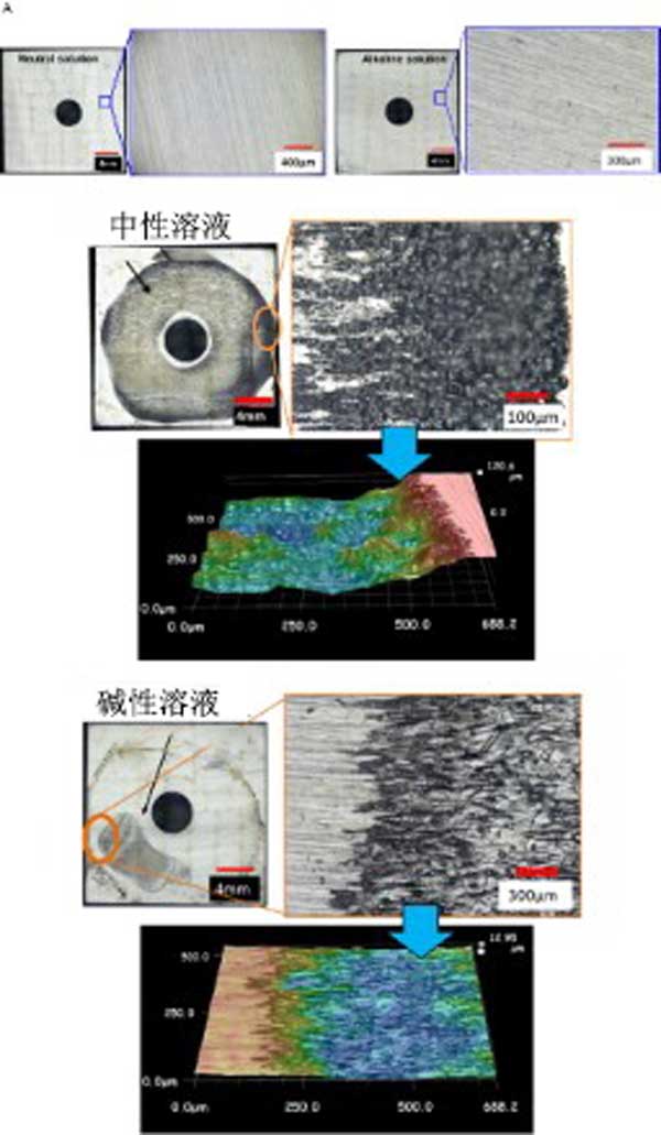 使用光學顯微鏡觀察實驗后樣品的表面形態(tài),如圖3所示。在中性和堿性溶液中未與活性炭接觸的樣品中未觀察到縫隙腐蝕。另一方面,在中性和堿性測試溶液中與活性炭接觸的樣品上發(fā)生縫隙腐蝕。這些結(jié)果清楚地表明,當樣品與活性炭接觸時,縫隙腐蝕敏感性增加。在中性測試溶液的情況下,最大腐蝕深度為130μm并且縫隙腐蝕傳播以覆蓋樣品的幾乎所有褶皺區(qū)域。在堿性測試溶液的情況下,最大腐蝕深度為25μm并且腐蝕區(qū)域遠小于中性溶液的情況。這些結(jié)果表明,在中性溶液的情況下腐蝕區(qū)域和深度更大,這表明在吸附塔中發(fā)生實際腐蝕。在堿性溶液的情況下腐蝕面積和深度較小的原因被認為是Fe(OH)2的溶解速率的事實堿性溶液減少,這導致腐蝕速率降低。基本上,在陽極部位的pH降低至去鈍化pH是縫隙腐蝕開始和傳播所必需的?紤]到這個方面,還可以解釋縫隙腐蝕行為的差異。