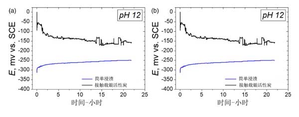 中性和堿性溶液中試樣的開路電位隨時間的變化如圖4所示。與銀浸漬活性炭接觸的樣品的開路電位在最初階段是高的,然后在中性和堿性溶液的實驗開始時急劇下降。根據(jù)這些結(jié)果,認為在實驗開始時發(fā)生縫隙腐蝕,當樣品與銀浸漬活性炭接觸時開路電位降低。結(jié)果表明“電化學效應(yīng)”是嚴重縫隙腐蝕的主要原因。